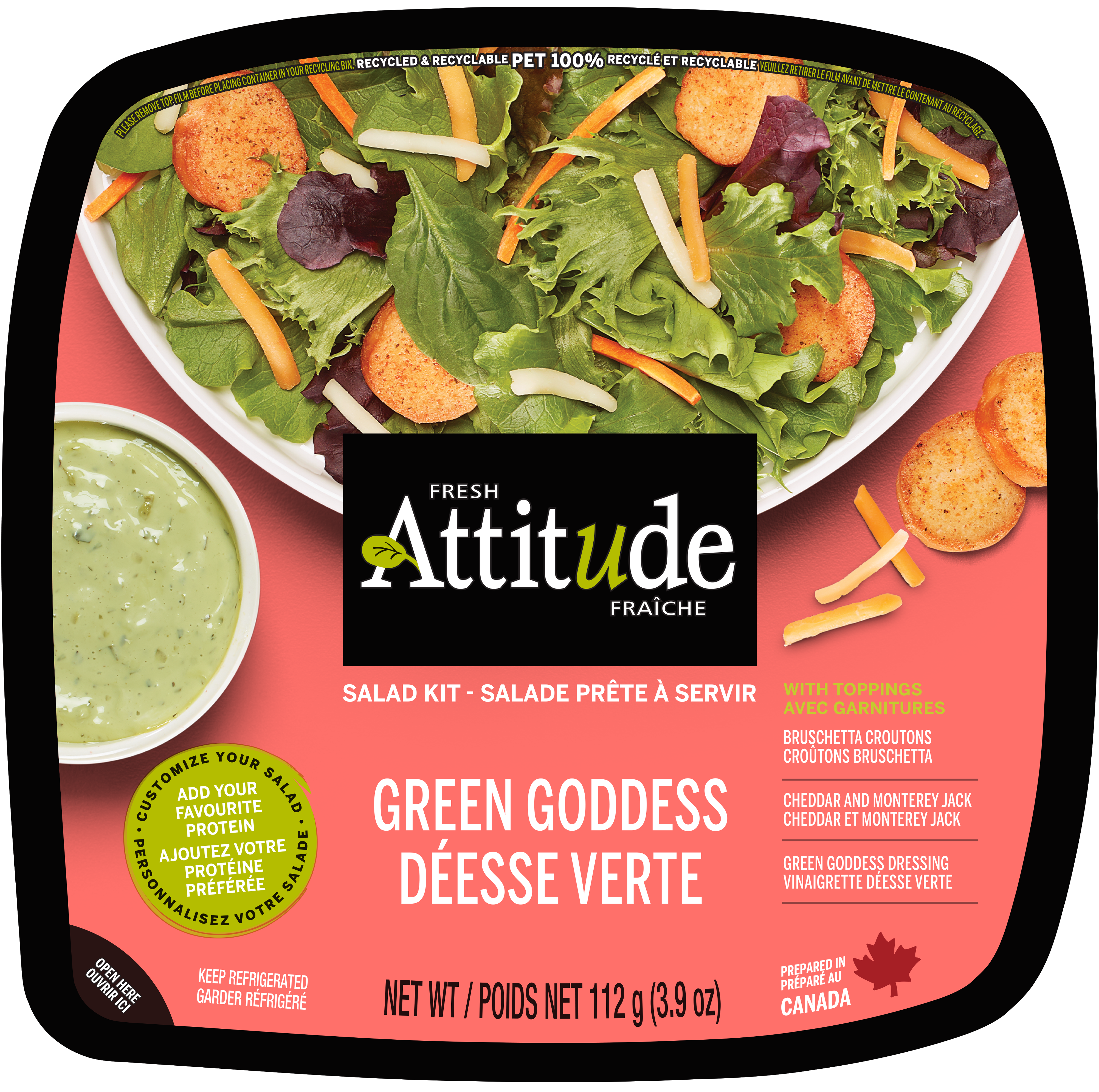 Notre nouvelle salade prête à manger Déesse Verte est une combinaison unique d’ingrédients aux saveurs riches, dont la profondeur et la finesse vous surprendra. Notre célèbre salade colorée mélange printanier est rehaussée de croûtons de bruschetta à saveur tomatée, d’un savant mélange de fromages Cheddar et Monterey jack et de la fameuse vinaigrette crémeuse aux fines herbes, «Déesse Verte». Un délice pour vos papilles!