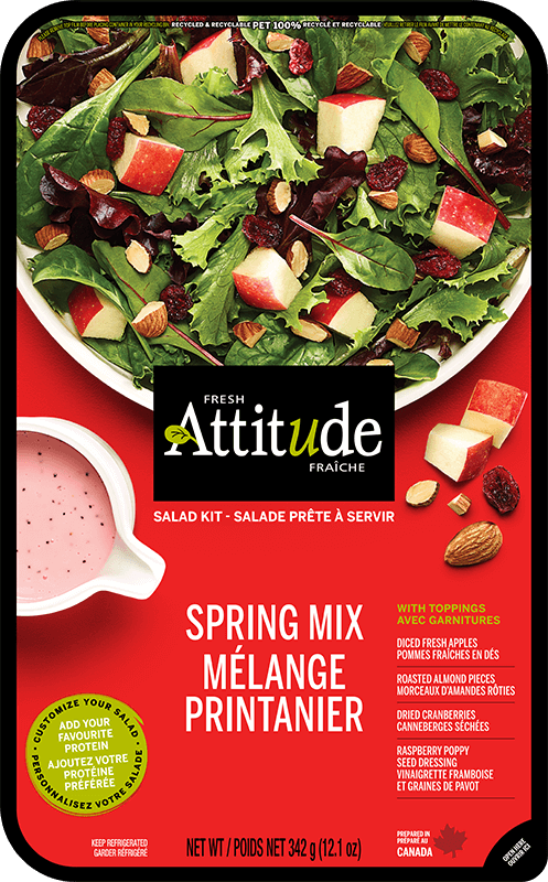 Découvrez notre savoureux mélange de mesclun, de pommes fraîches, d’amandes rôties et de canneberges séchées. Mélangez tous les ingrédients directement dans le récipient et ajoutez la vinaigrette aux framboises et aux graines de pavot afin d’obtenir une parfaite salade sucrée-salée en un clin d’œil.
